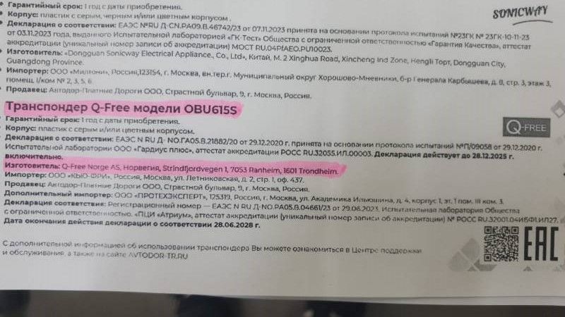 Транспондер T-pass серия «Q-FREE» (производитель чипа - Норвегия)